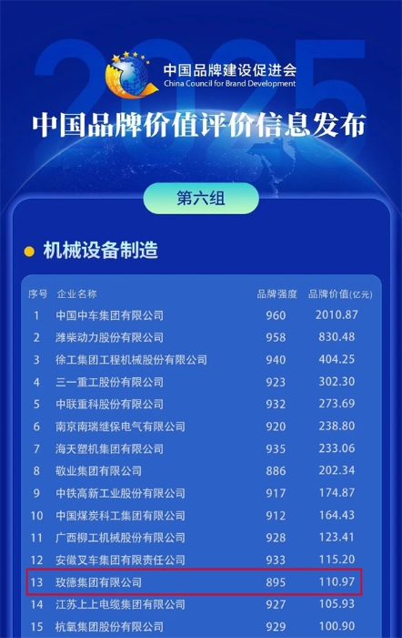 玫德集團(tuán)憑借卓越的品牌實(shí)力和行業(yè)影響力,以110.97億元的品牌價(jià)值登榜“機(jī)械設(shè)備制造組”榮譽(yù)榜,較2024年的102.04億元增長8.93億元,彰顯了集團(tuán)持續(xù)創(chuàng)新的發(fā)展韌性和品牌價(jià)值的強(qiáng)勁攀升。
