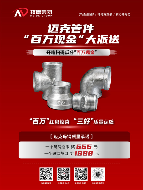 即日起,凡購(gòu)買(mǎi)玫德集團(tuán)邁克牌瑪鋼、溝槽管件,有機(jī)會(huì)參與開(kāi)箱掃碼瓜分 “百萬(wàn)現(xiàn)金” 活動(dòng)!