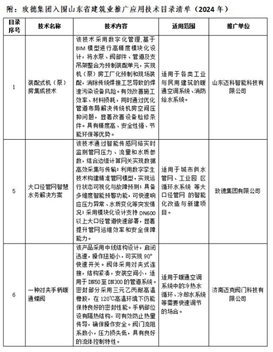 近日,山東省住房和城鄉(xiāng)建設廳發(fā)布了《山東省建筑業(yè)推廣應用技術目錄(2024年度)》, 玫德集團旗下玫德集團有限公司、濟南邁克閥門科技有限公司、山東邁科智能科技有限公司各有1項成果入選;其中《大口徑管網智慧水務解決方案》成為山東省住建廳重點選取的有引領性、示范性和產業(yè)帶動作用的標志性成果之一。此次征集聚焦居住品質提升、綠色低碳等重點領域,涵蓋新技術、新材料、新工藝、新產品,全省共遴選出36項成果。