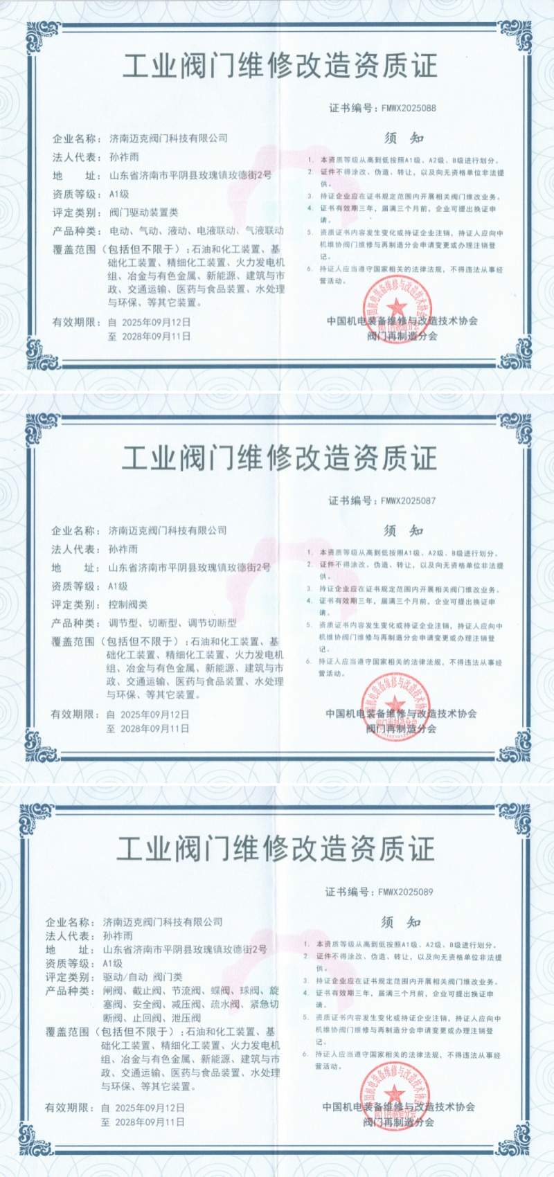 2025年8月20日,玫德集團(tuán)向中機(jī)維協(xié)閥門再制造分會(huì)提交了“工業(yè)閥門維修與再制造企業(yè)資質(zhì)等級(jí)評(píng)定申請(qǐng)表”,分別申請(qǐng)了:驅(qū)動(dòng)/自動(dòng)閥門、控制閥門、閥門驅(qū)動(dòng)裝置三個(gè)類別。2025年9月4日-5日,中機(jī)維協(xié)閥門再制造分會(huì)派遣專家評(píng)審組對(duì)玫德集團(tuán)進(jìn)行了運(yùn)維、維修與改造資質(zhì)現(xiàn)場(chǎng)評(píng)審。