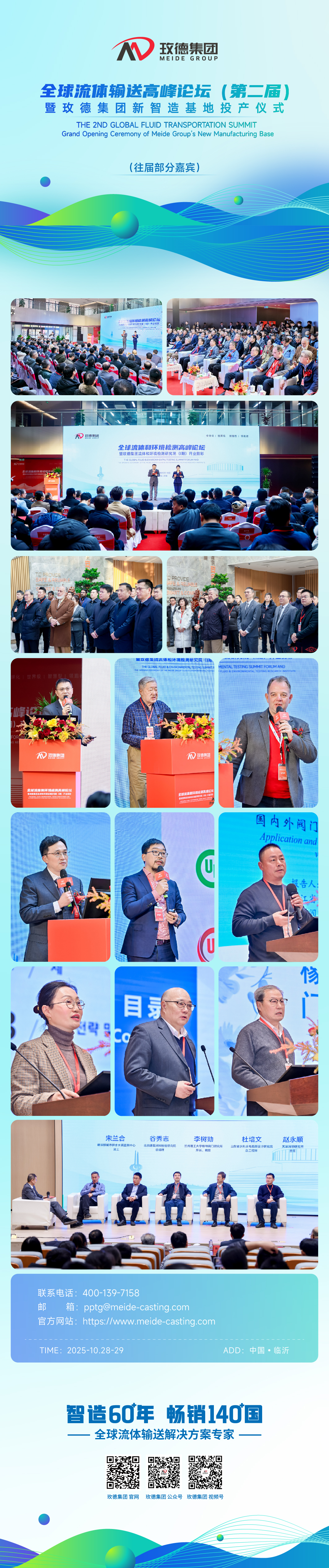 全球流體輸送高峰論壇(第二屆)暨玫德集團(tuán)新智造基地投產(chǎn)儀式將于2025年10月28日至29日在山東臨沂隆重召開!本屆論壇將邀請(qǐng)全球頂尖專家及學(xué)術(shù)骨干等300余人,匯聚行業(yè)智慧,共探前沿技術(shù)。論壇將聚焦市政、建筑、工業(yè)與電力等領(lǐng)域,圍繞行業(yè)政策、發(fā)展動(dòng)態(tài)與未來(lái)展望開展深度研討,共同探討行業(yè)發(fā)展的新機(jī)遇與新挑戰(zhàn)。