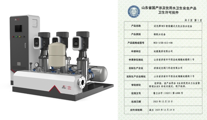 近日,玫德集團(tuán)旗下三類給水系列產(chǎn)品成功取得衛(wèi)生許可批件,標(biāo)志著集團(tuán)在民用及市政給水領(lǐng)域的合規(guī)性與安全性獲得權(quán)威認(rèn)可。本次獲批產(chǎn)品包括:玫德集團(tuán)有限公司生產(chǎn)的“邁克牌MCG智能罐式無(wú)負(fù)壓供水設(shè)備”、濟(jì)南邁克閥門(mén)科技有限公司生產(chǎn)的“邁克牌給水用EPDM型三元乙丙橡膠密封墊”以及玫德艾瓦茲(濟(jì)南)金屬制品有限公司生產(chǎn)的“邁克牌給水用不銹鋼波紋管”。