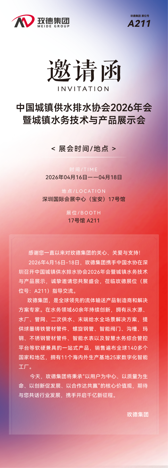 中國城鎮(zhèn)供水排水協(xié)會2026年會暨城鎮(zhèn)水務(wù)技術(shù)與產(chǎn)品展示|玫德集團誠邀您共聚盛會!